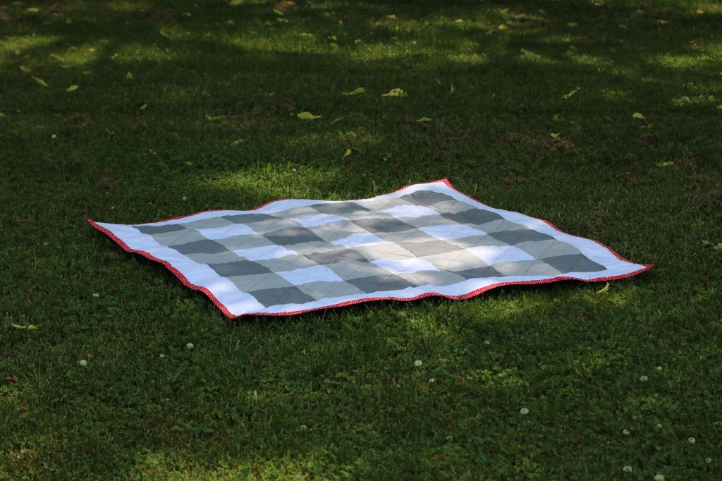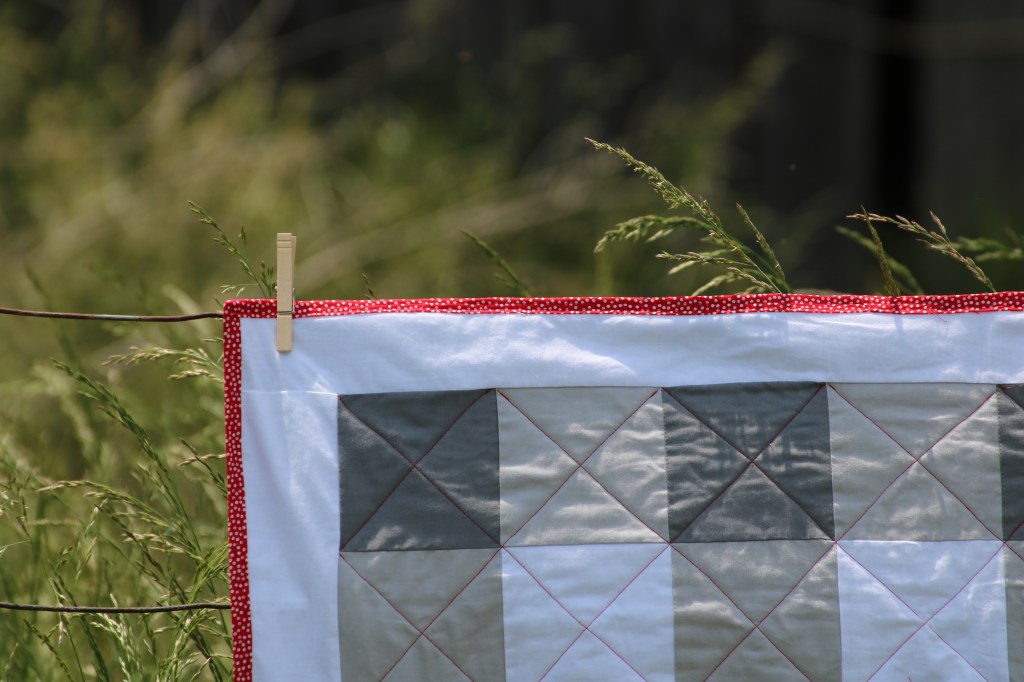 Better Homes and Gardens or Good Housekeeping or somebody that I read said that every house needs a gingham quilt. I think that’s a pretty good idea. 😉 This neutral quilt is so versatile. Red thread quilting and red and white polkadot binding gives it a little pop of color.