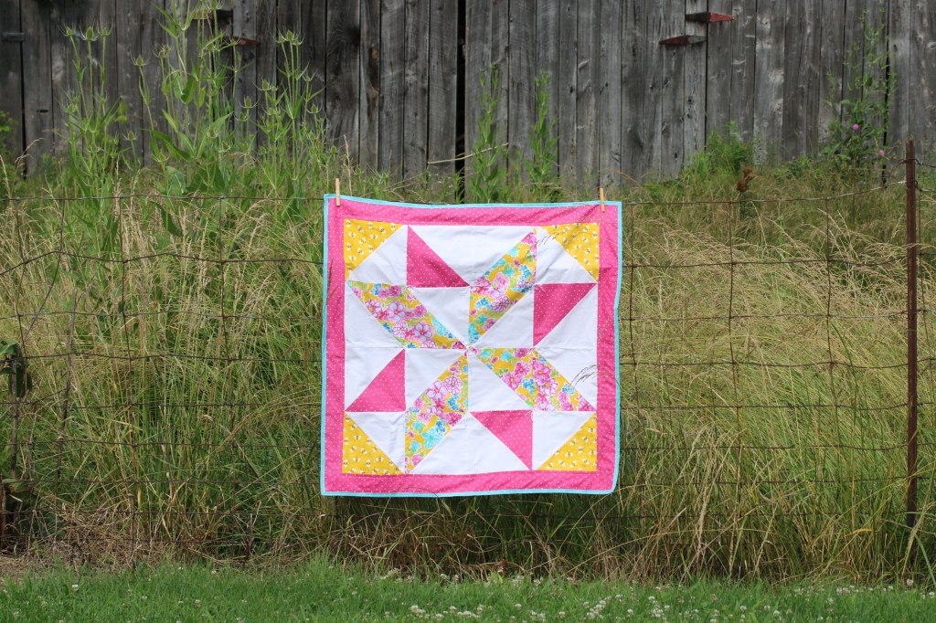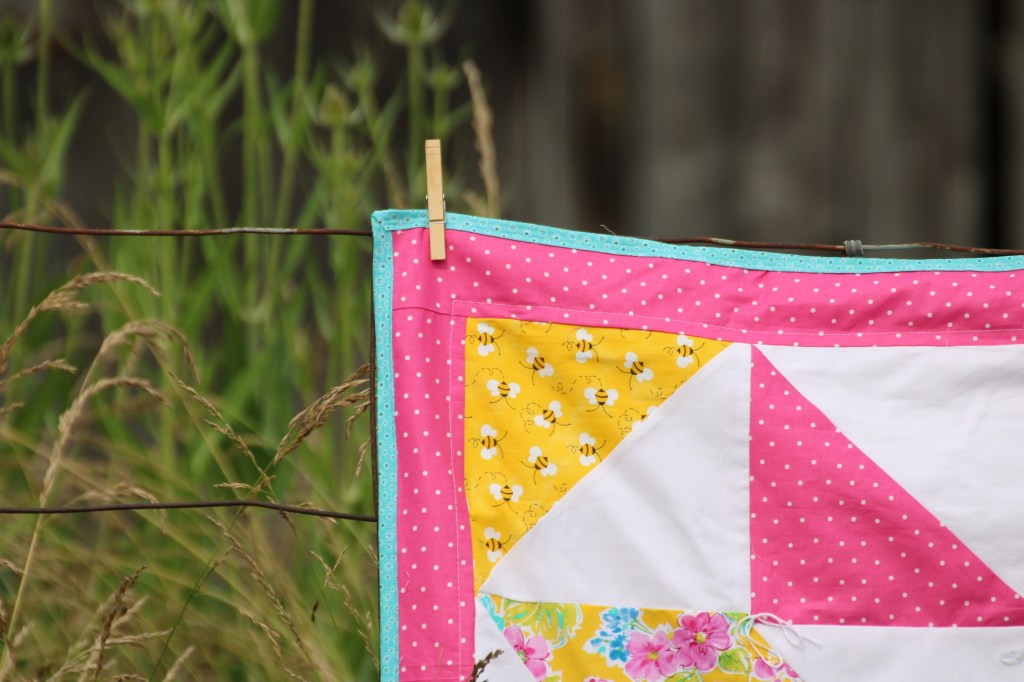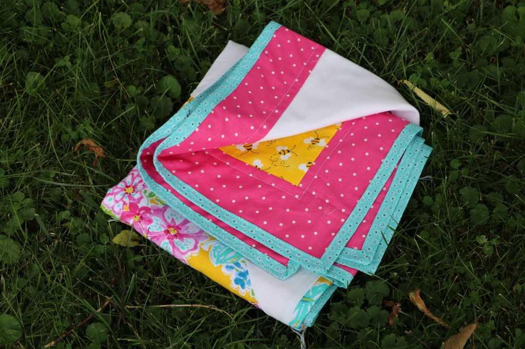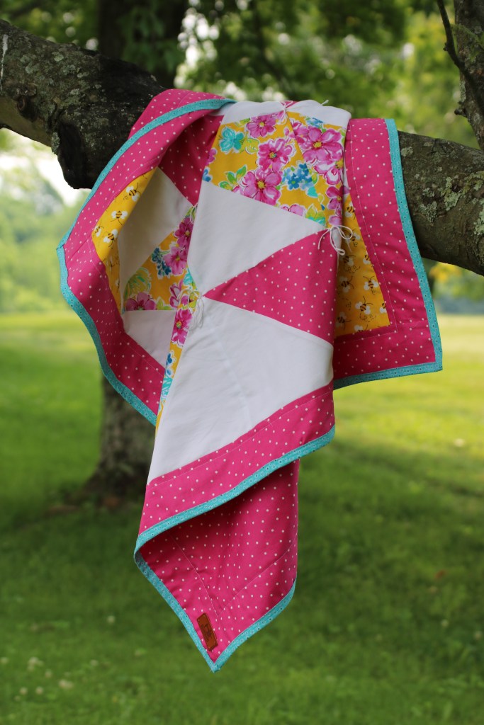 I see this quilt as one of those that a little girl drags around everywhere. 🙂 Soft, lightweight and bright. This is what some consider a “Summer Quilt”–it has a lighter weight batting so it drapes (I’ve learned that’s what quilters call it 😉 It means the way it hangs/lays) so so pretty. Flowers, bees, and polkadots all come together super cute. Hand tied.
